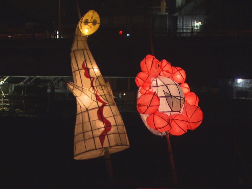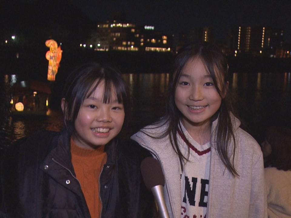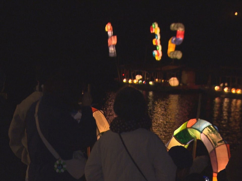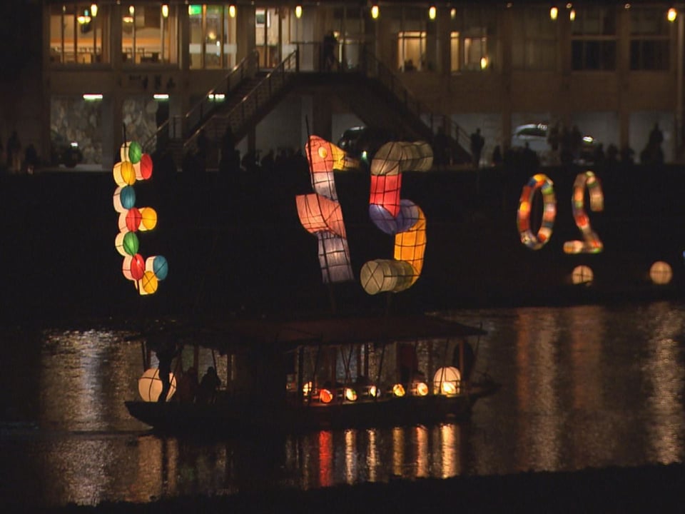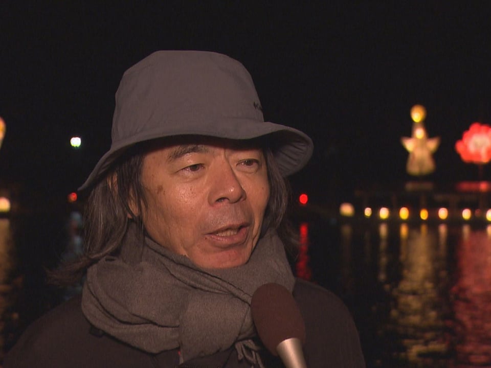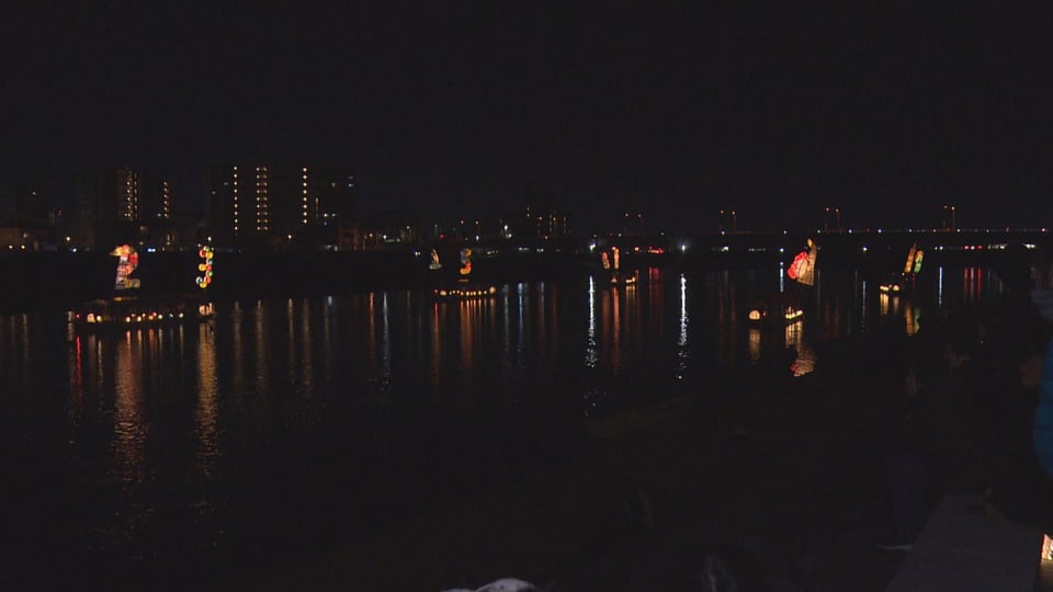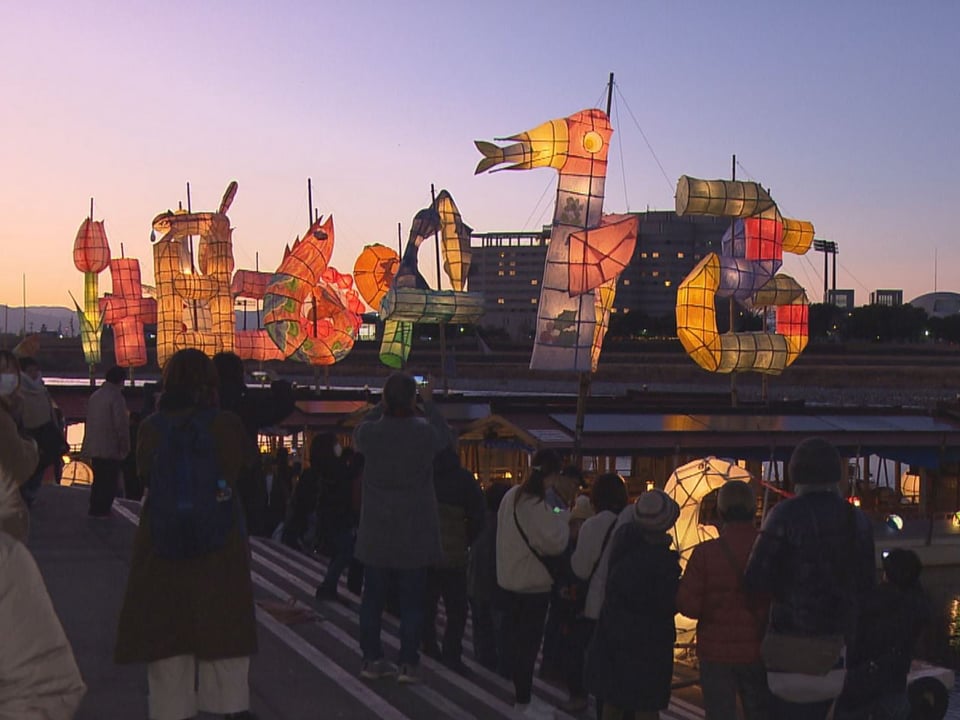 今年は大阪・関西万博にちなんだ行灯も登場し、川沿いで大勢の人たちがまもなく幕を閉じる1年に思いをはせながら、冬の夜闇に浮かび上がる幻想的な灯りを見入っていました。