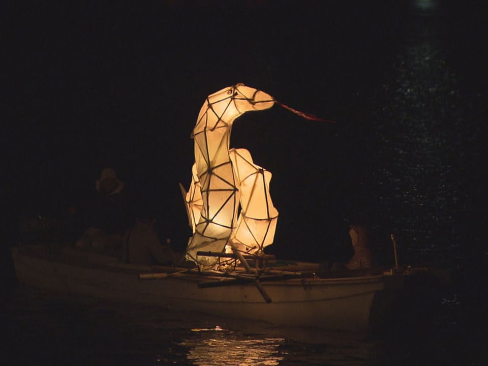 干支の船を先頭に行灯を載せた船がゆっくりと進みます。