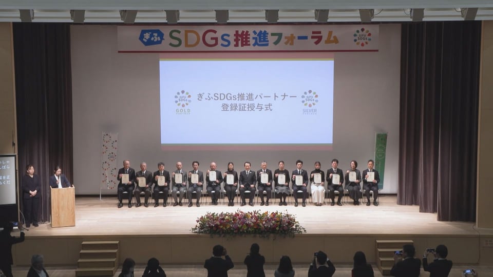 この日は「ぎふSDGs推進パートナー登録制度」の登録証授与式も行われ、ゴールドパートナーの13事業者、シルバーパートナーの137事業者の代表者に登録証が授与されました。