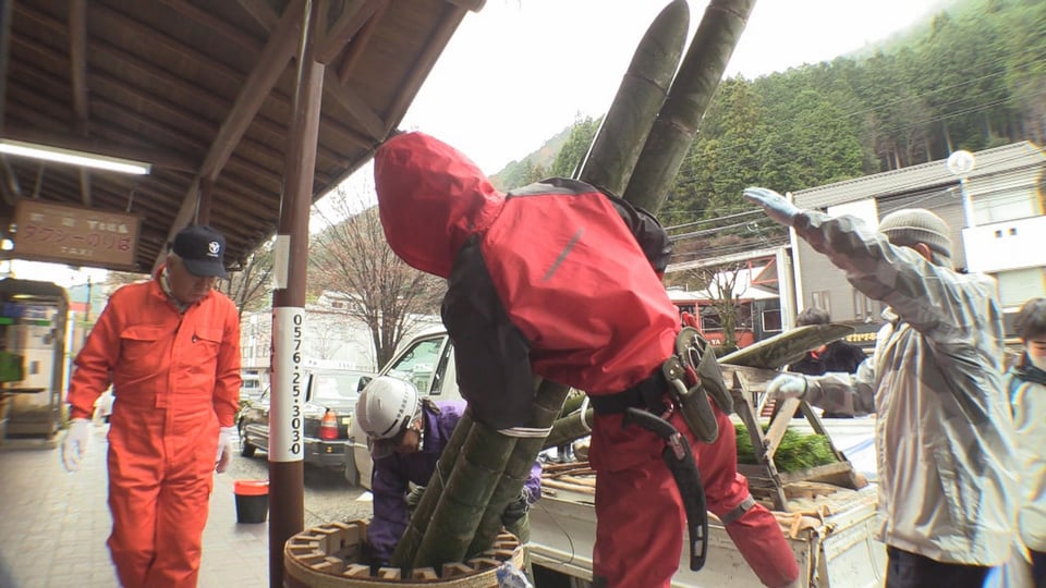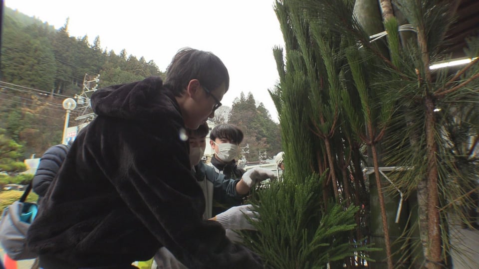 設置作業には下呂地区自治会連合会と地元造園業者、それに地元の中学生の約20人が参加し、竹を土台に固定した後、中学生が中心となって松や梅の枝や杉の葉、赤色のナンテンなどを華やかに飾り付けました。