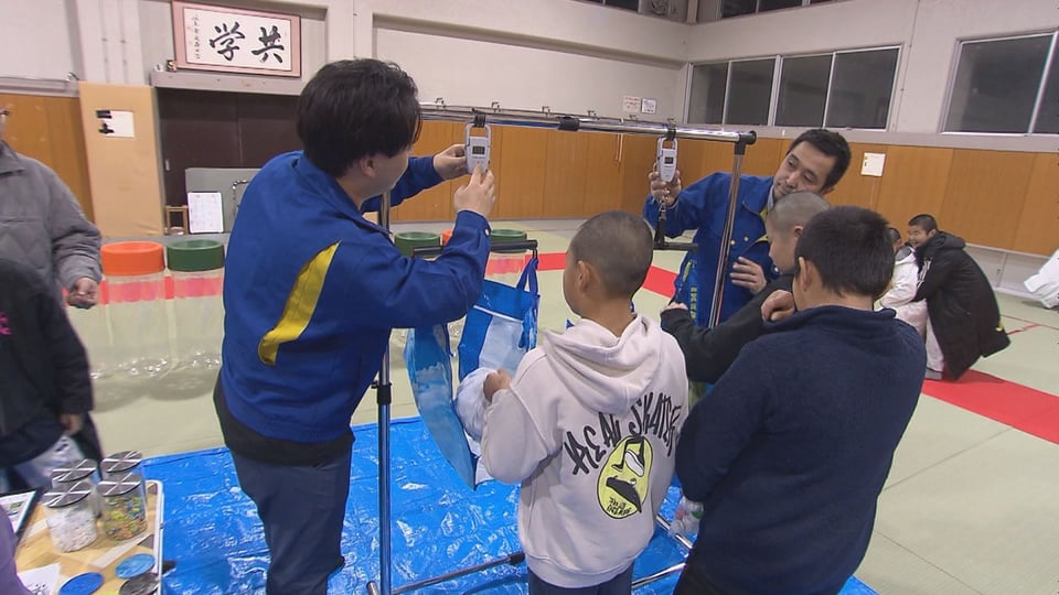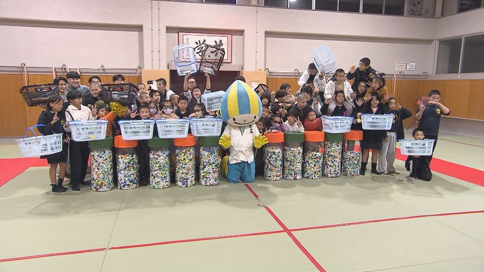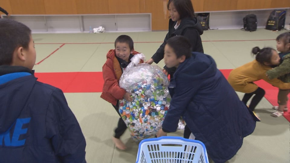 子どもたちは、自宅や地域で集めたキャップの入った袋を順に計量し、重さが発表されると歓声が上がっていました。