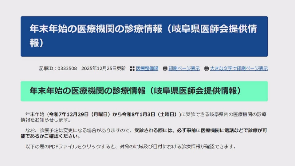多くの医療機関が休診となる12月27日から1月4日までの救急医療体制については、受診可能な医療機関が県のホームページで確認できます。【最新情報のアドレス https://www.pref.gifu.lg.jp/site/pressrelease/333507.html 】