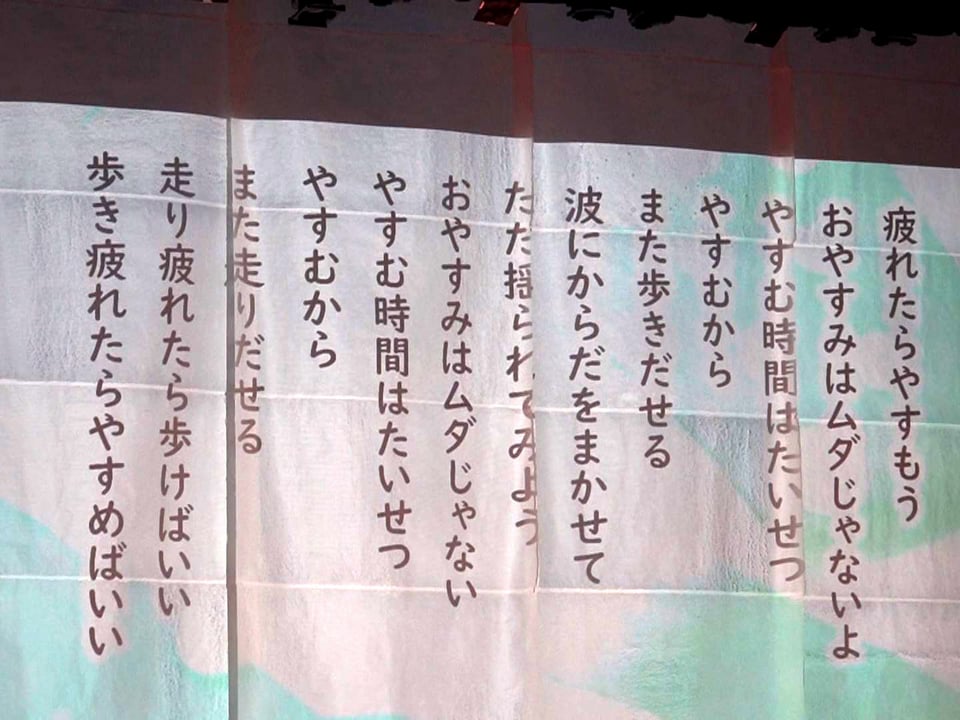 生演奏のBGMと合唱団の歌声を背景にストーリーが展開され、出演者のせりふや歌はすべてステージ後方に字幕として投影されました。