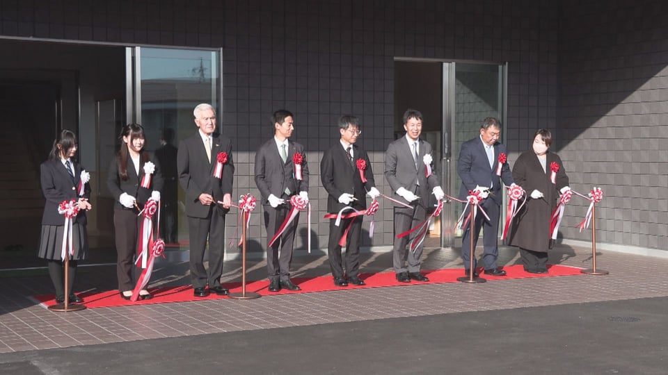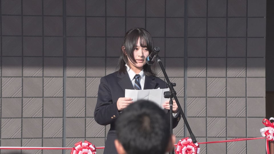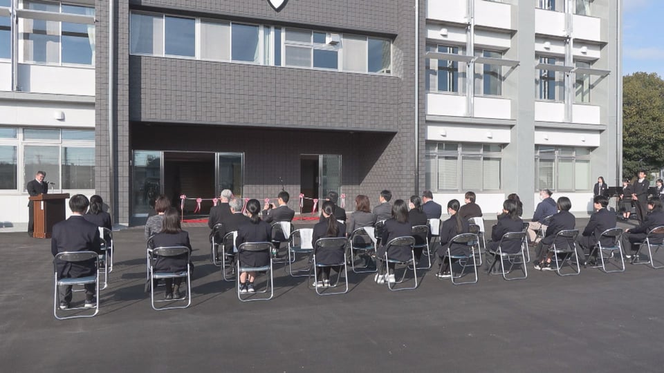 式典で、全日制生徒会長の土岐紗侑里さんが「新校舎を大切に使用し、学びと経験を糧にして夢や目標に向かい力強く歩み続ける」と決意を語り、関係者がテープカットで完成を祝いました。