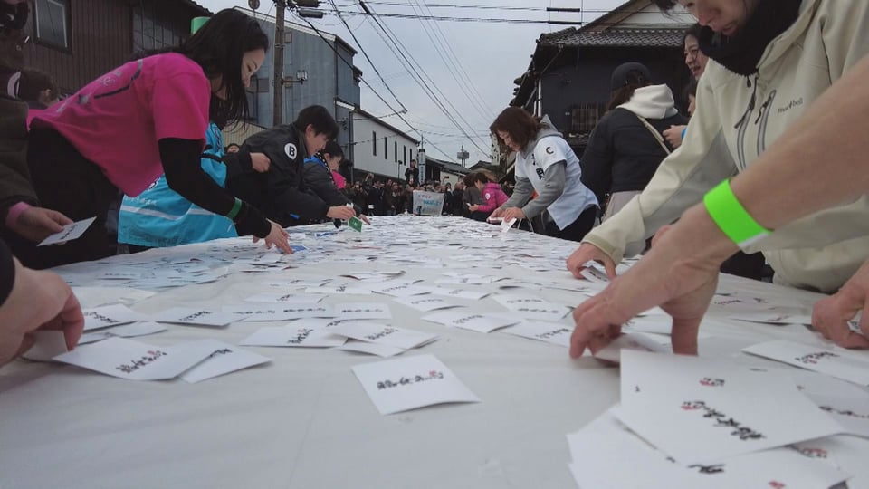 「そして、例祭の初めての試みが「福女チャレンジ」です。500メートルを走るのですが、ただ走るだけではダメなんです。抽選の時にもらったリストバンドと同じ色のカードをたくさんのカードの中から見つけ出さなければなりません。ダミーも含まれていますので、運も必要になってきます。運をつかみ取り、7人の福女に、誰がなるのか注目です」