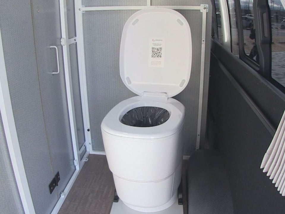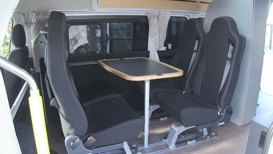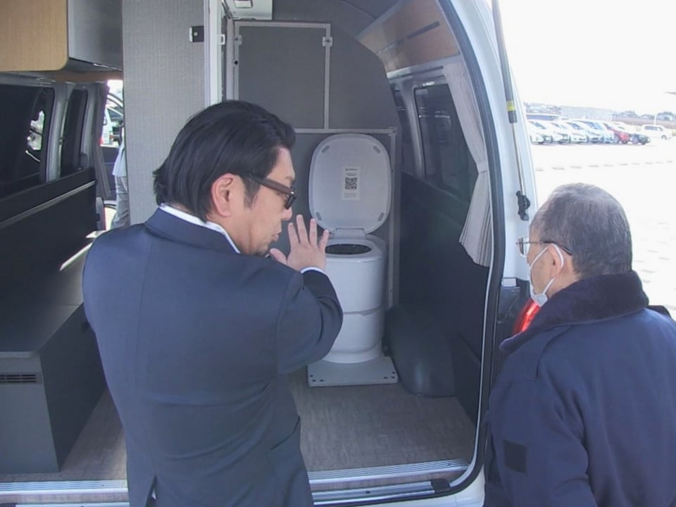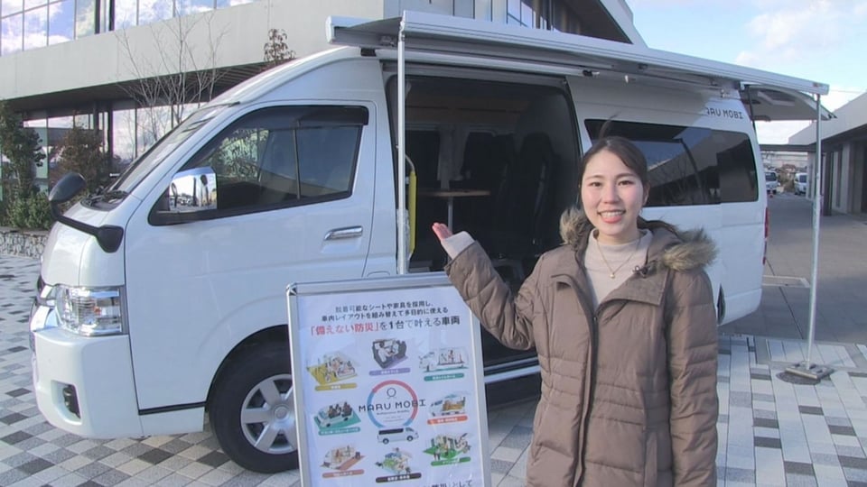 「こちら、多目的車両『マルモビ』です。車内にはテーブルといすが設置されていますが、取り外しが可能で、公用車や移動投票所などとして活用が検討されています。そして、平時だけでなく有事の際も活用できるものとして、水のいらないトイレが現在設置されています。もしもの時に助け合いができるこの『マルモビ』を通じた協定が、岐阜県を中心に広がっています」