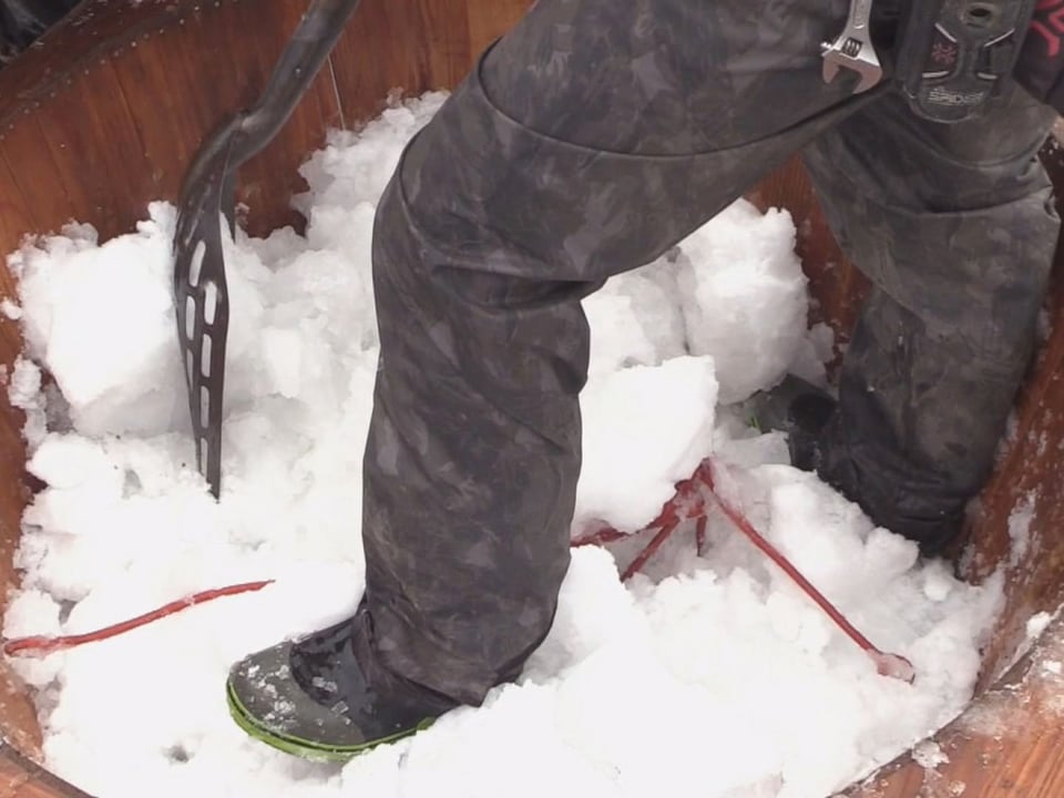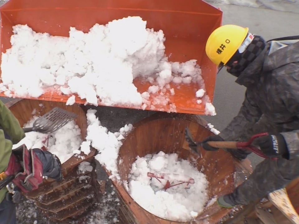 使うのは積雪の多い黒内地域で集めた大型トラック22杯分の雪です。除雪車両がバケットですくい、水を加えてシャーベット状にしたものを高さ約2メートルの木の枠にスコップなどで詰め込んで、塩を振りかけて固めていました。