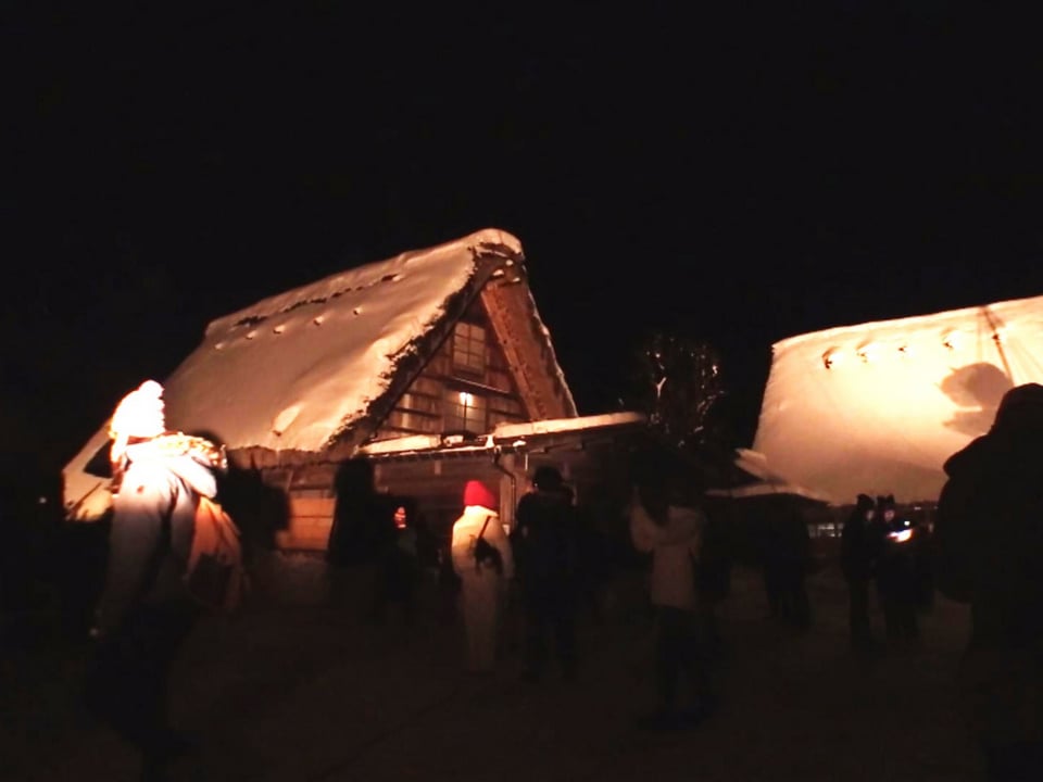 初日の12日夜のライトアップは、国内外から多くの観光客が集まり、午後5時過ぎから32棟の合掌家屋が、108個のライトで照らされ、温かな明かりに浮かび上がる幻想的な光景が広がりました。