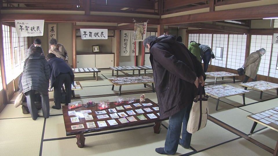 この展示は、地域住民らでつくる「井の口まちづくり会 まちなかアート部会」が毎年主催していて、過去最多の427枚の年賀状が並べられました。