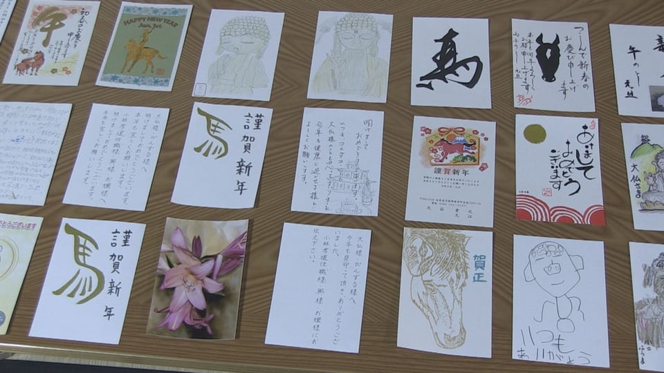 年賀状には、柔らかい表情の岐阜大仏の絵に新年の抱負が添えられた作品や干支の「午」にちなんだ力作などがそろい、まちなかアート部会の小林 孝夫会長は「昨今、年賀状離れが進んでいるが、これだけ多くの年賀状が集まって楽しい。今年も良い一年になることを祈っている」と話していました。