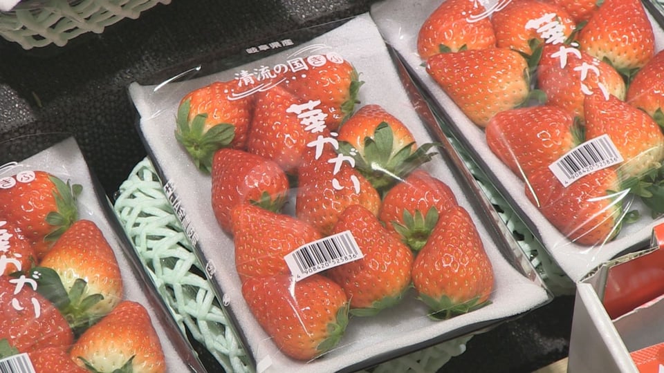 フェアは県産イチゴの魅力を知ってもらおうとJA全農岐阜が企画したのもので、酸味が少なく果汁があふれる「華かがり」、甘みと酸味のバランスに優れる「美濃娘」、大粒で果実が柔らかい「濃姫」の3種類が用意されました。
