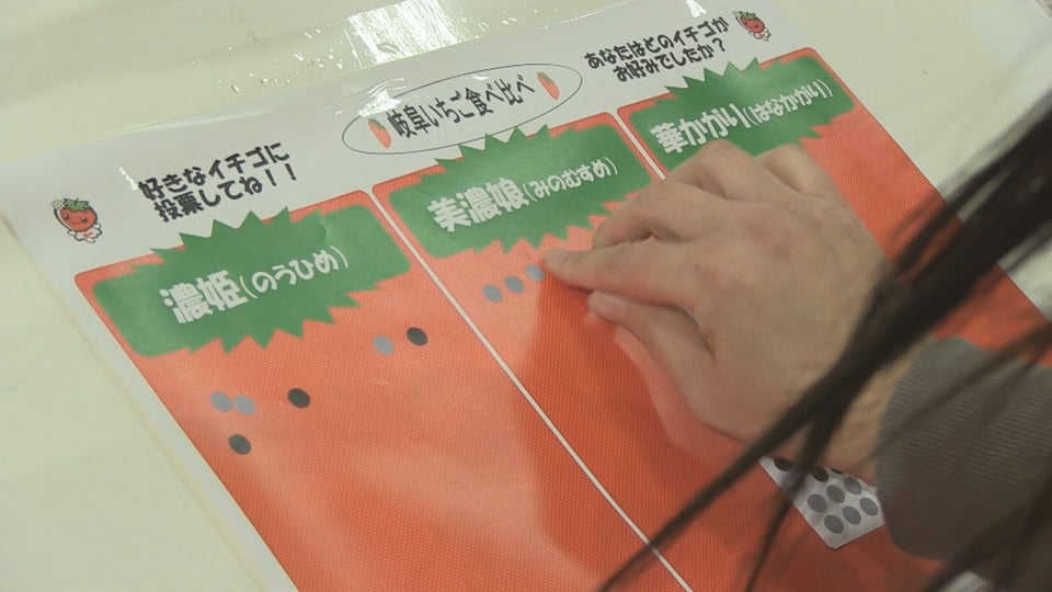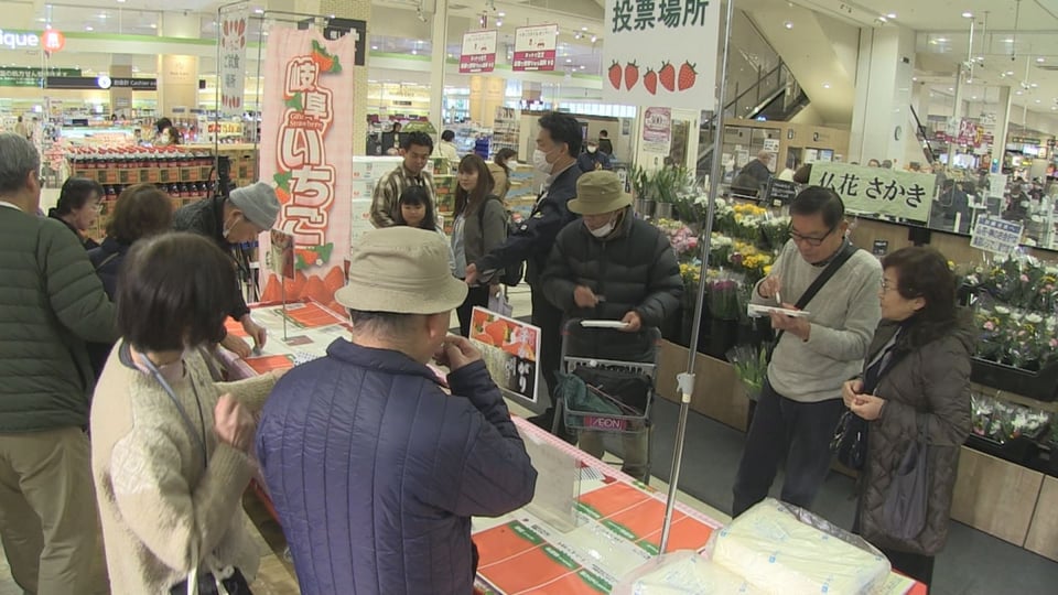 各務原市のイオンスタイル各務原インターの特設会場では、買い物客ら400人が食べ比べを楽しみ、一番おいしいと感じたイチゴに投票していました。