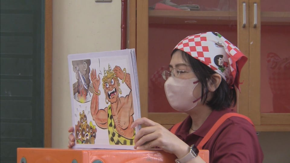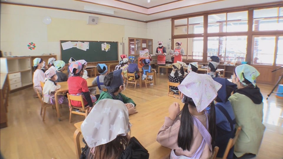 職員らは園児に、紙芝居で節分の豆まきの由来を読み聞かせてから、恵方を向いて食べると福を招くとされる太巻きづくりを指導しました。