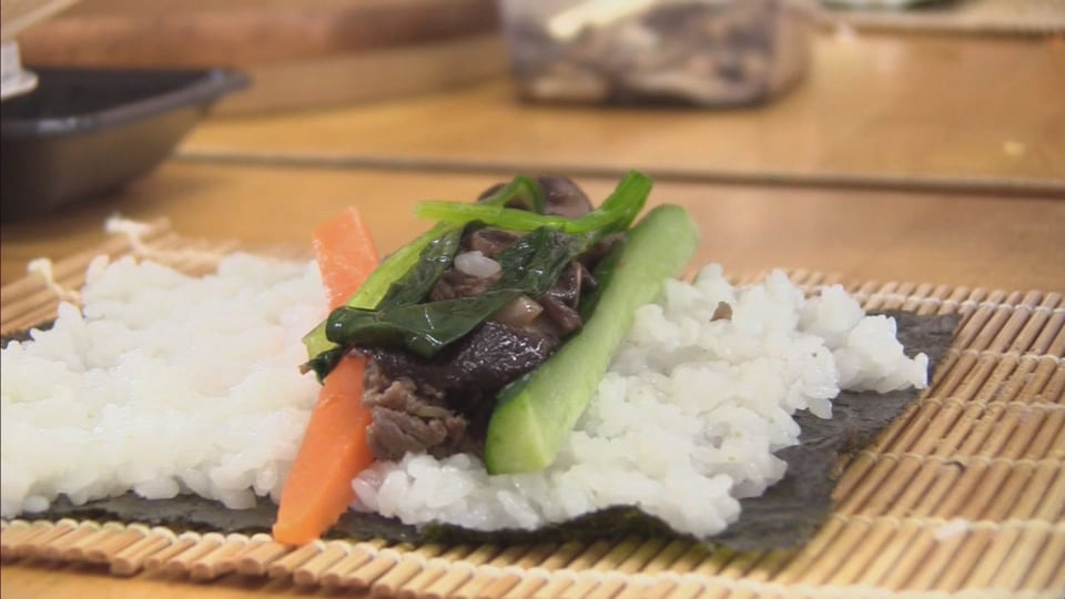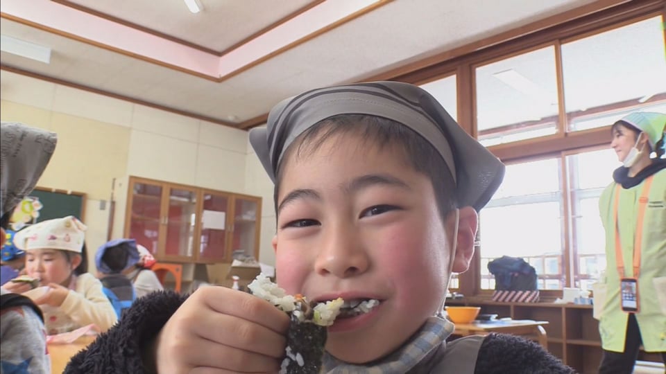 児童たちは、焼海苔に酢飯を乗せてもらうとその上にニンジンやキュウリ、飛騨牛のしぐれ煮や地元産のシイタケ、ホウレンソウや卵などをのせ、「巻きす」で慎重に巻いて完成させると、今年の恵方「南南東」を向いて、さっそく味わっていました。