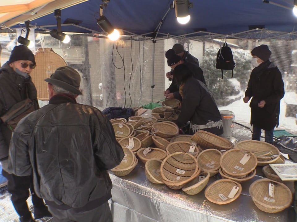 ことしは雪が降りしきる中での開催となりましたが、多くの観光客らでにぎわい、ヒノキとイチイの木を薄く削って編んだ「宮笠」や、朴の木を削り出して作る「有道しゃくし」、