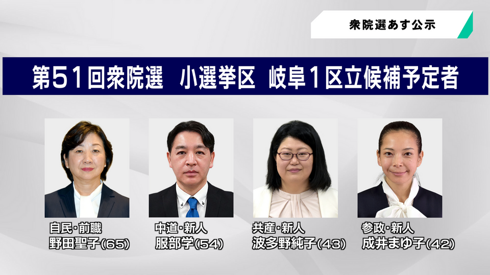 岐阜1区には、自民・前職の 野田聖子さん、中道改革連合・新人の服部学さん、共産・新人の波多野純子さん、参政・新人の 成井まゆ子さんの4人が立候補を表明しています。