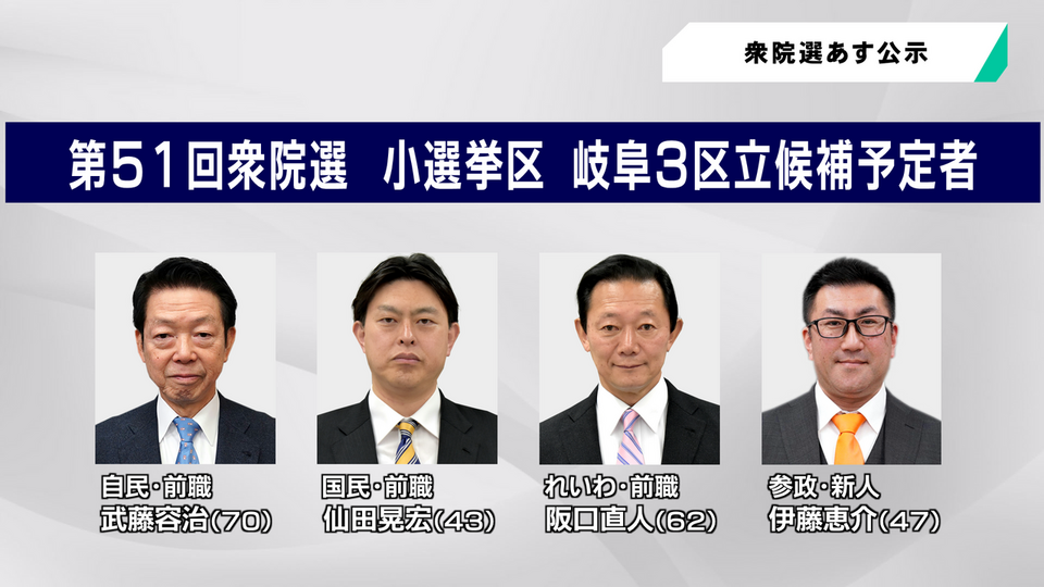 岐阜3区には、自民・前職の武藤容治さん、国民・前職の仙田晃宏さん、れいわ・前職の阪口直人さん、参政・新人の伊藤恵介さんが立候補を表明しています。