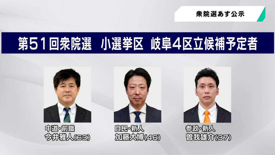 岐阜4区には、中道・前職の今井雅人さん、自民・新人の加藤大博さん、参政・新人の曽我雄介さんの3人が立候補を表明しています。
