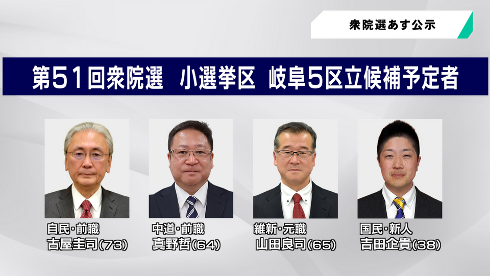 岐阜5区には、自民・前職の古屋圭司さん、中道・前職の真野哲さん、維新・元職の山田良司さん、国民・新人の吉田企貴さんが立候補を表明しています。