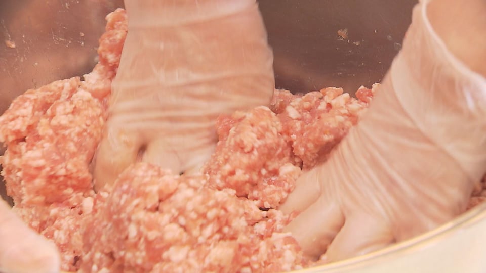 参加者は岩塩で漬け込んだ豚ひき肉にスパイスと水を加えて混ぜ合わせた後、「スタッファー」と呼ばれる機械で羊の腸に詰め、10センチ間隔でねじり、ソーセージの形にしていきました。