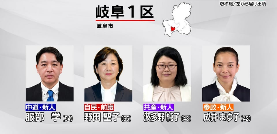 岐阜1区に立候補したのは届け出順に、中道・新人の服部学さん(54)、自民・前職の野田聖子さん(65)、共産・新人の波多野純子さん(43)、参政・新人の成井まゆ子さん(42)の4人です。岐阜1区は、自民の前職に中道、共産、参政のいずれも新人3人が挑む形です。