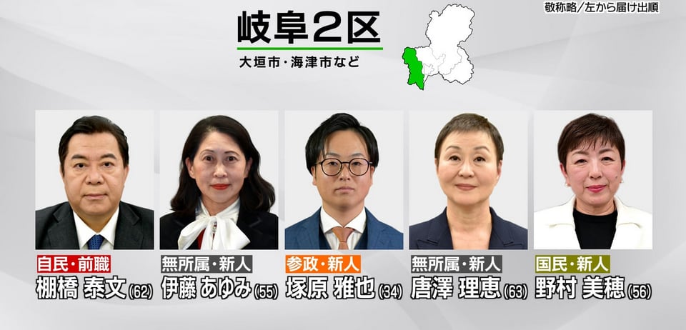 岐阜2区は県内の小選挙区では最も多い5人が立候補しました。届け出順に、自民・前職の棚橋泰文さん(62)、無所属・新人の伊藤あゆみさん(55)、参政・新人の塚原雅也さん(34)、無所属・新人の唐澤理恵さん(63)、国民・新人の野村美穂さん(56)です。自民の前職に 国民民主と参政、それに無所属の新人4人が挑みます。