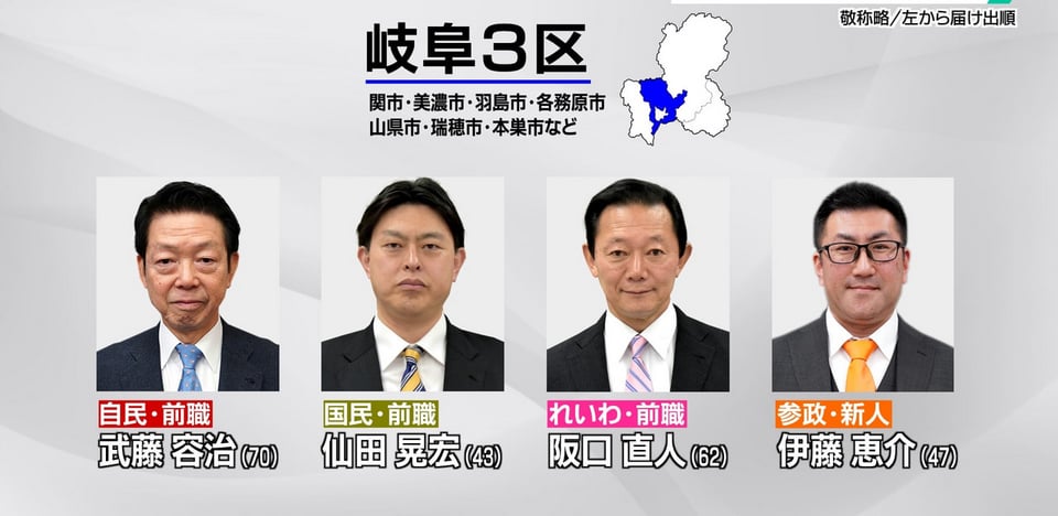 岐阜3区には4人が立候補しました。届け出順に、自民・前職の武藤容治さん(70)、国民・前職の仙田晃宏さん(43)、れいわ・前職の阪口直人さん(62)、参政・新人の伊藤恵介さん(47)です。国民民主とれいわ新選組の前職は、いずれも前回、比例代表で復活当選を果たしていて、岐阜3区は3人の前職と新人1人が議席を争います。
