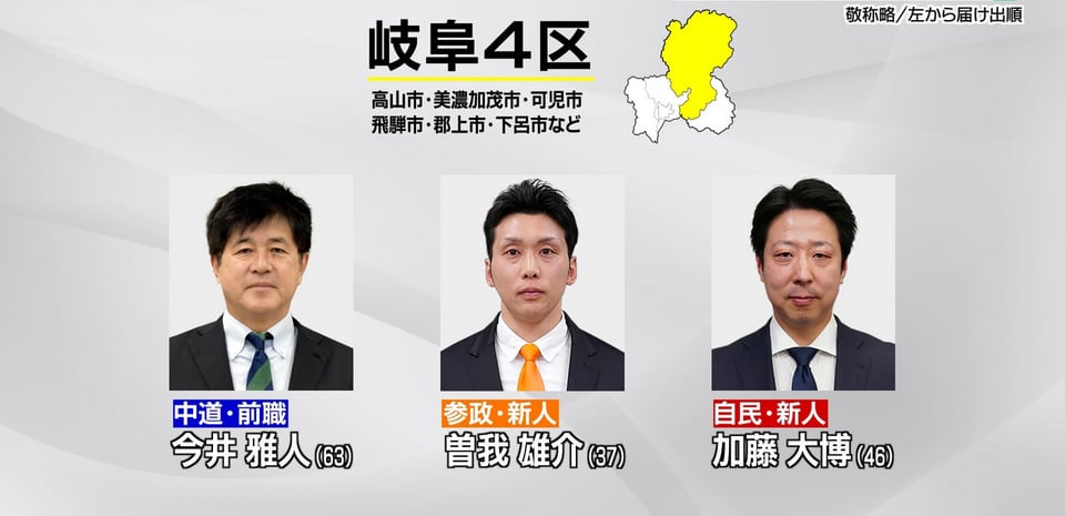 岐阜4区には3人が立候補しました。届け出順に、中道・前職の今井雅人さん(63)、参政・新人の曽我雄介さん(37)、自民・新人の加藤大博さん(46)です。前回、選挙区で当選して保守地盤の一角を切り崩した中道の前職に、議席の奪還を目指す自民の新人と、参政の新人が挑みます。