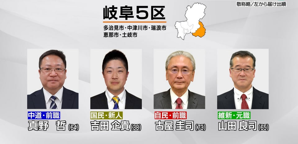 最後に岐阜5区。立候補者は4人で届け出順に、中道・前職の真野哲さん(64)、国民・新人の吉田企貴さん(38)、自民・前職の古屋圭司さん(73)、維新・元職の山田良司さん(65)です。連立を組む自民と維新の候補が同じ選挙区に立っているほか、労働組合票が見込める中道と国民の候補も同じ選挙区で戦います。