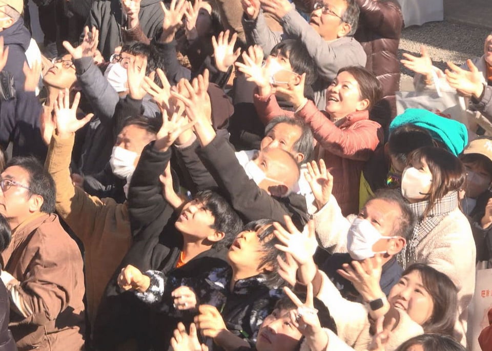 「福は内」の掛け声に合わせて舞台から一斉に豆がまかれると、参加者らは手や袋を広げ、懸命に豆の入った小袋を取っていました。