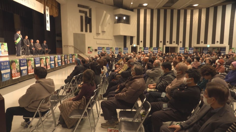 各報道機関の情勢調査で中道改革連合の苦戦が報じられる中、6日に可児市で行われた今井氏の総決起集会。険しい表情で支援者に訴えます。