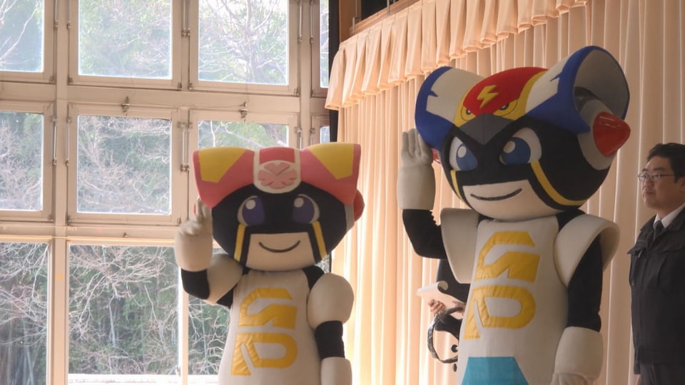 続いて、県警の公式マスコット「RAI」と「REN」、そして山県警察署のマスコット「がたこちゃん」が登場。道路での左右確認や手を挙げての横断などの大切さを身振りや手振りで伝えました。