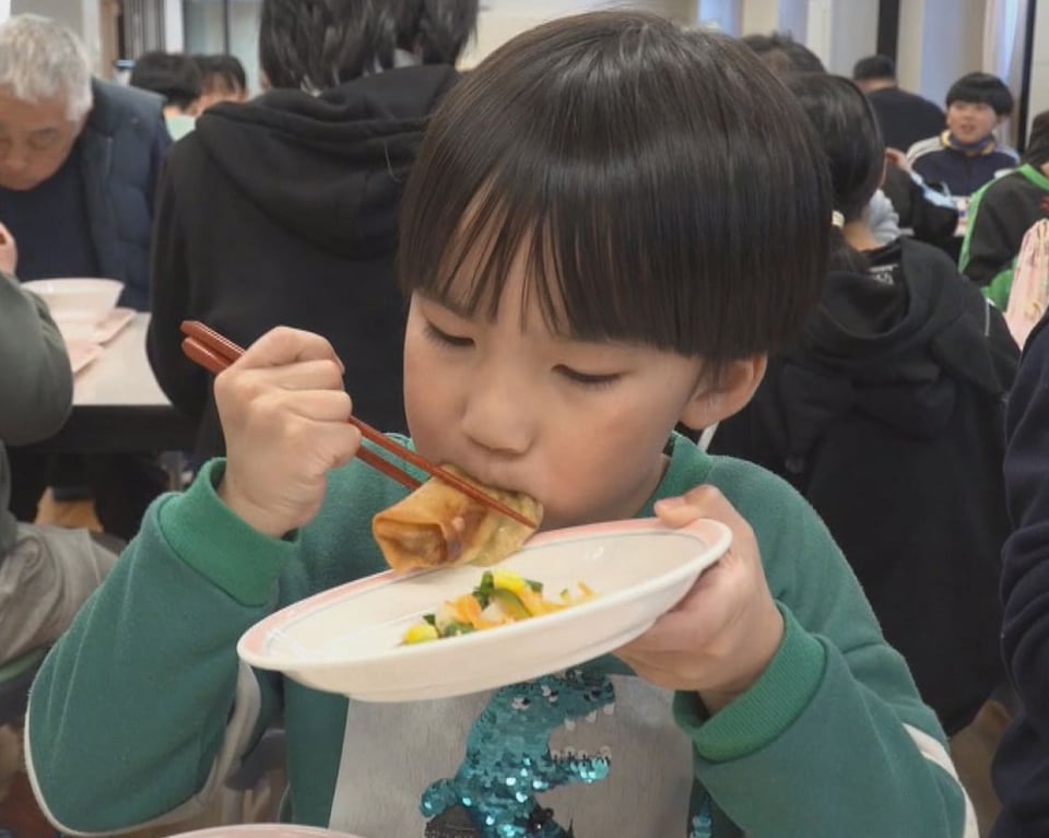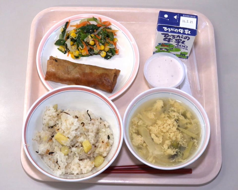 ランチルームには、地元産の野菜や山菜、キノコなどを具材に使った春巻きやスープ、地元産のブルーベリーを使用したヨーグルトゼリーなどが並び、児童生徒は地域の食材がふんだんに盛り込まれ、食べやすい味付けに工夫された献立を味わっていました。