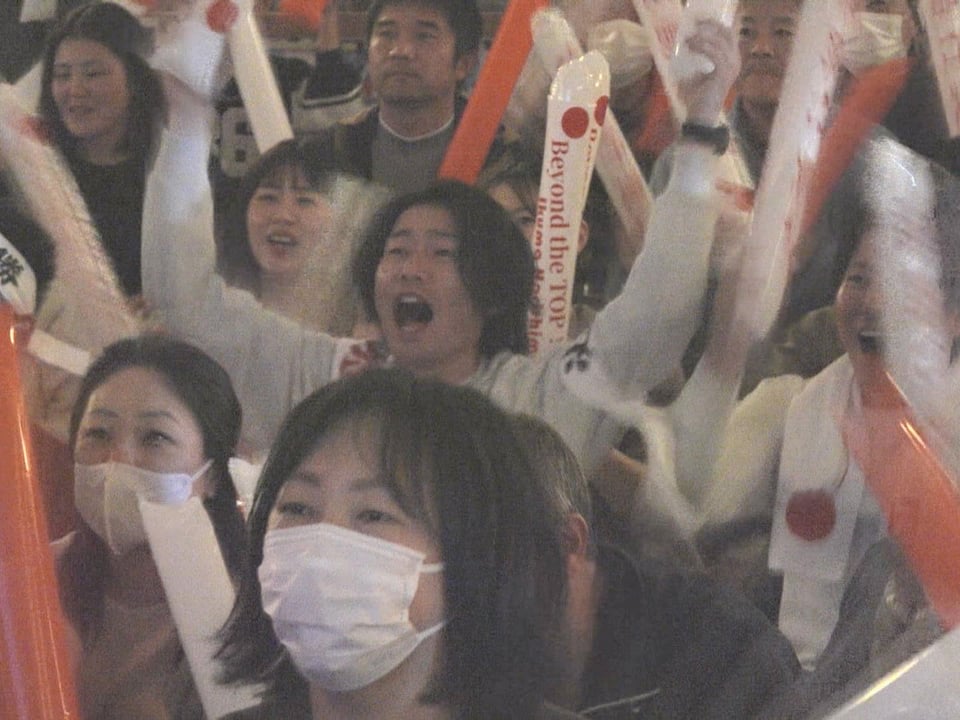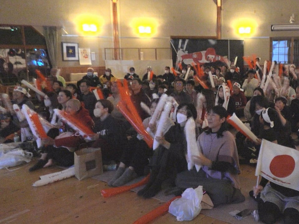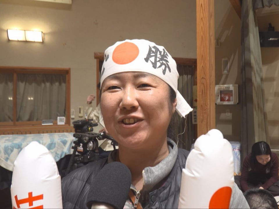 池田こども園では元モーグル選手で堀島選手の姉の有紗さんも駆け付け、堀島選手の同級生や町民ら約100人がスティックバルーンや手作りのうちわを手に応援しました。