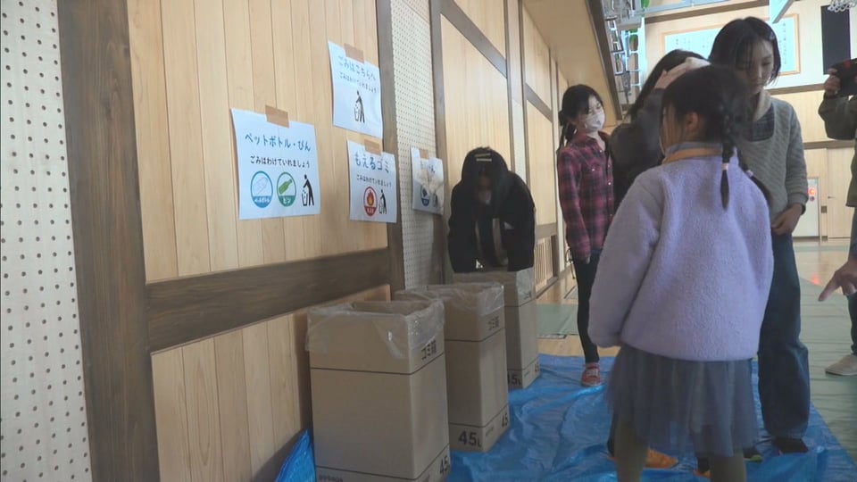 避難所の開設では、手順が記された「アクションシート」に沿って、避難者の受け入れ準備や、施設内の動線を示すシートの設置などが手際よく進められ、子どもたちも協力してパーテーションやゴミ箱を運びました。