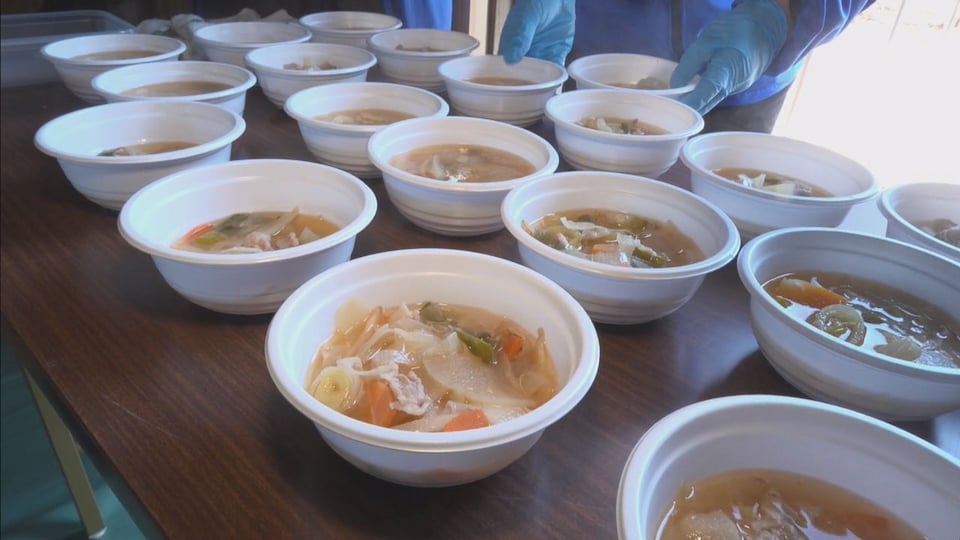 続いて、非常食や水の配布、冬の寒さの中で体を温める炊き出しの豚汁の提供も行われました。