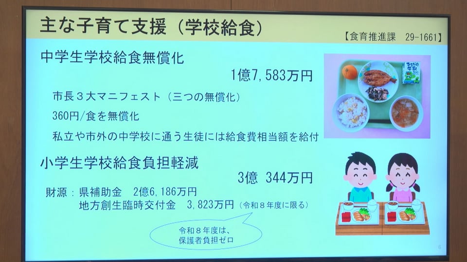 歳出では、中学校の給食無償化に1億7583万円が計上され、市立中学校以外の生徒にも給食費相当額の年間約7万円を給付するとしています。