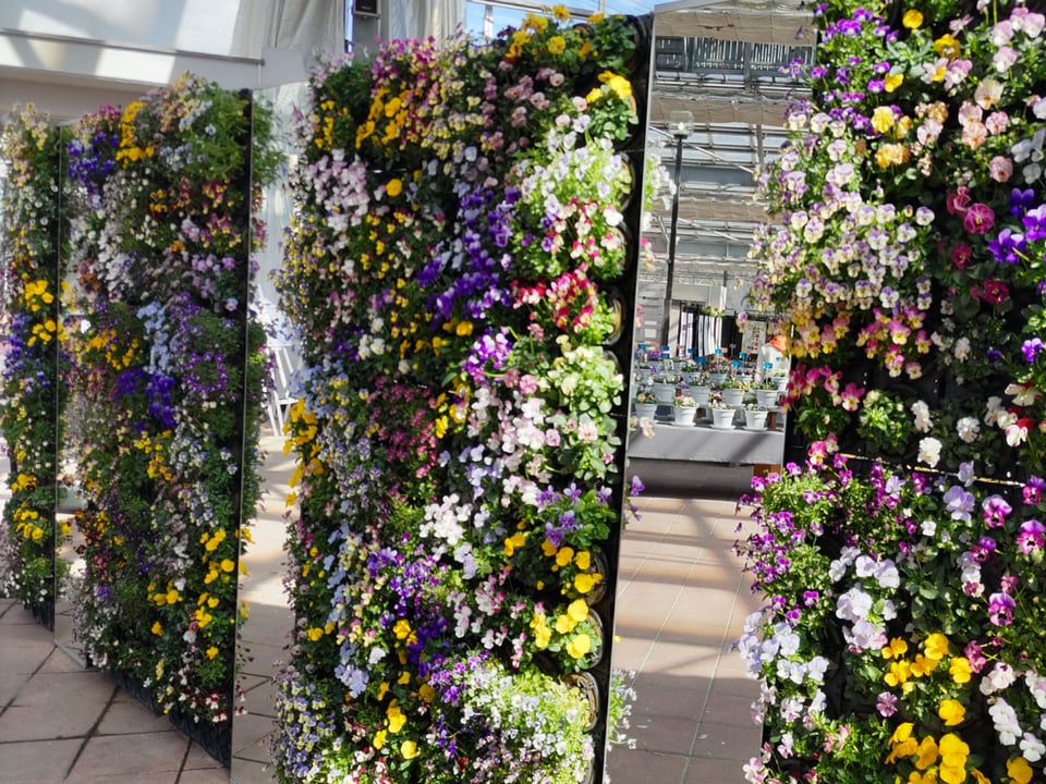 入り口には20品種のパンジー・ビオラで飾られたビオラウォールがフォトスポットとして設けられており来場者らがカメラやスマホで写真に収めていました。また、ヒストリーパネルも展示され、歴史や品種の変遷、特徴も紹介されています。
