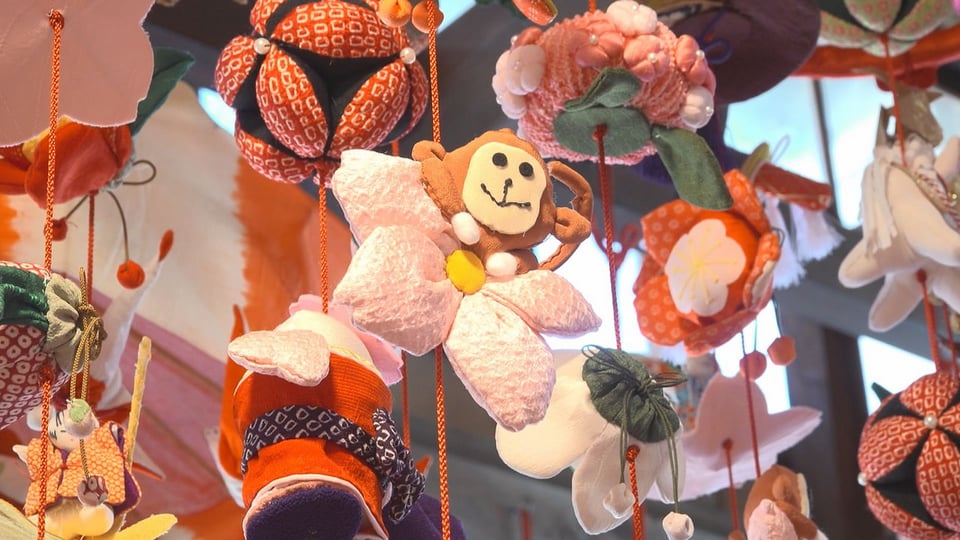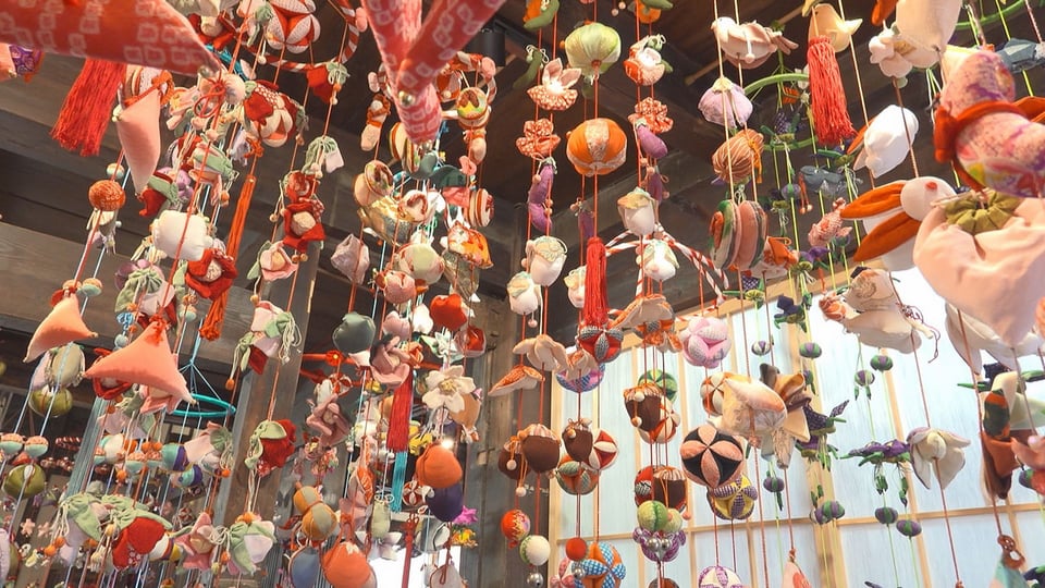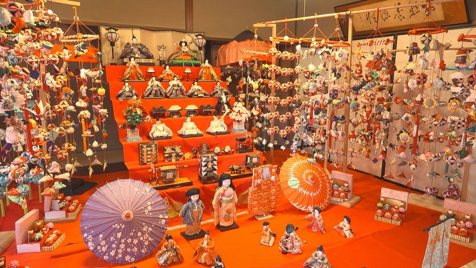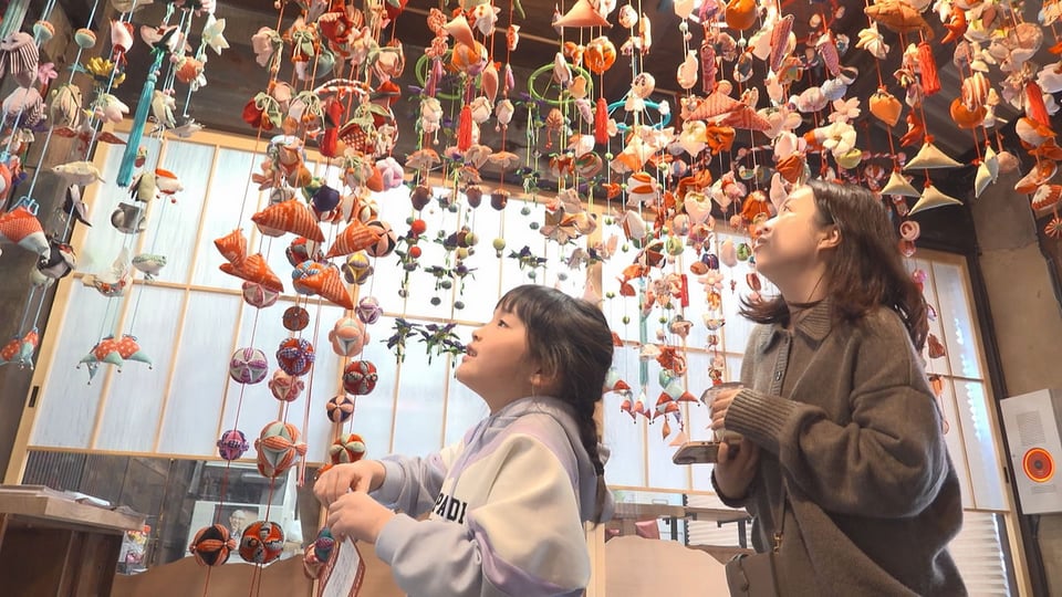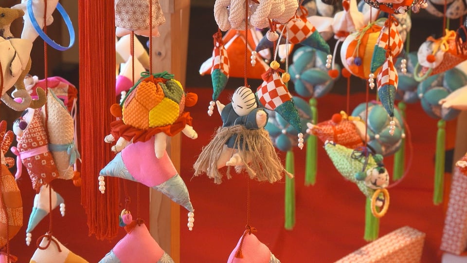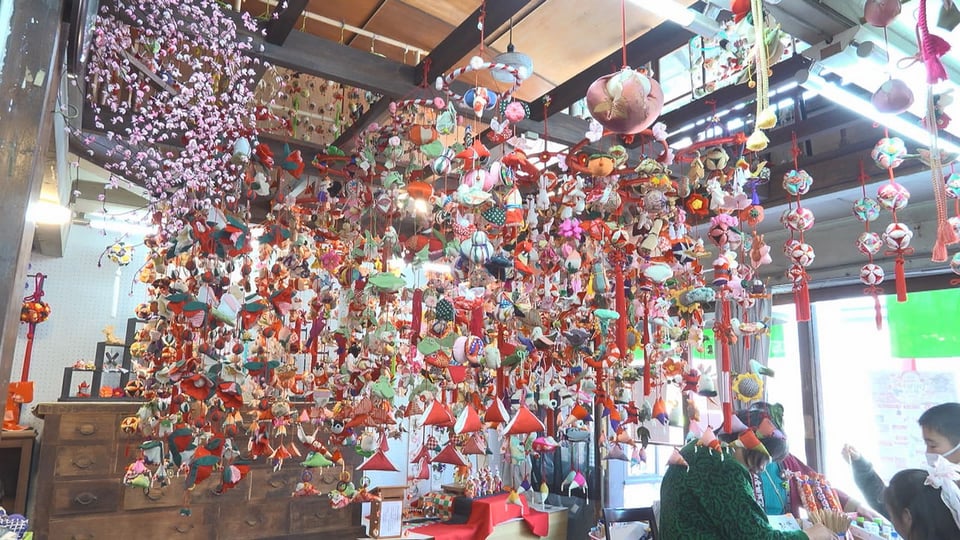 子どもの健やかな成長を願って飾る「つりびな」は、地元の会員26人が着物の端切れなどから手作りしたもので、趣ある古民家などがかわいらしい飾りで彩られています。