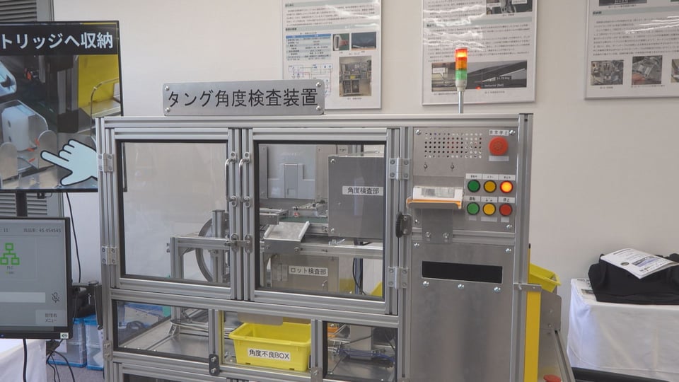 また、応用課程の学生らが製作した装置の展示もあり、ニンジンの出荷時にカメラ映像でキズやシミなどを検出して品質を自動判別する装置や、画像処理と音声機能で視覚障害者や車いすの利用者が作業しやすいように設計されたシートベルト用金具の検査装置など、実社会の課題解決につながる技術の数々が注目を集めていました。
