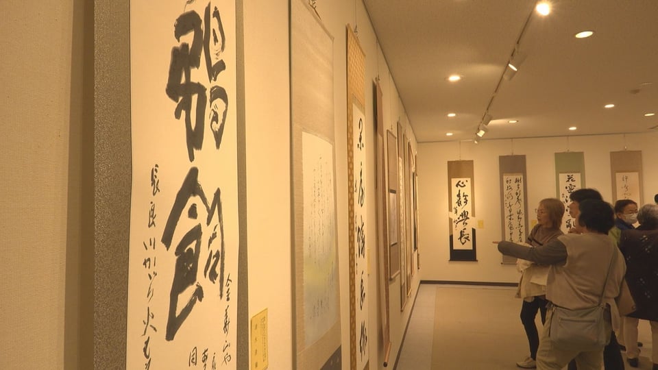会場には、県内在住の若手から重鎮まで書作家129人が書き上げた漢字や仮名、てん刻、調和体などの多彩な作品が1点1点軸に表装されて並び、来場者らは墨の濃淡や筆づかいで表現される日本の伝統美に見入っていました。