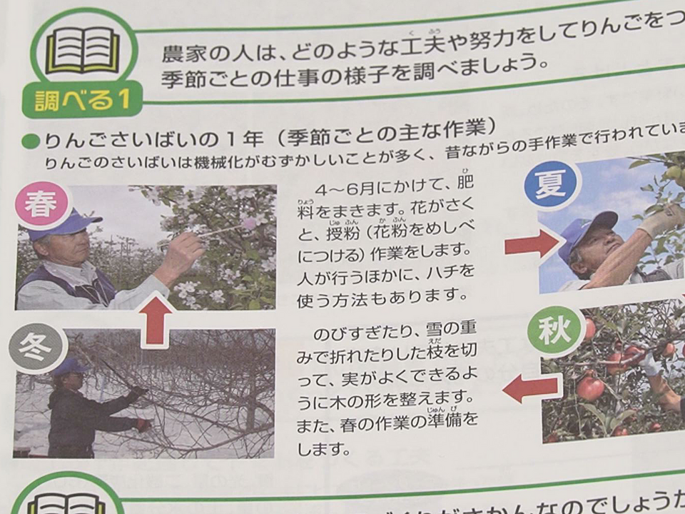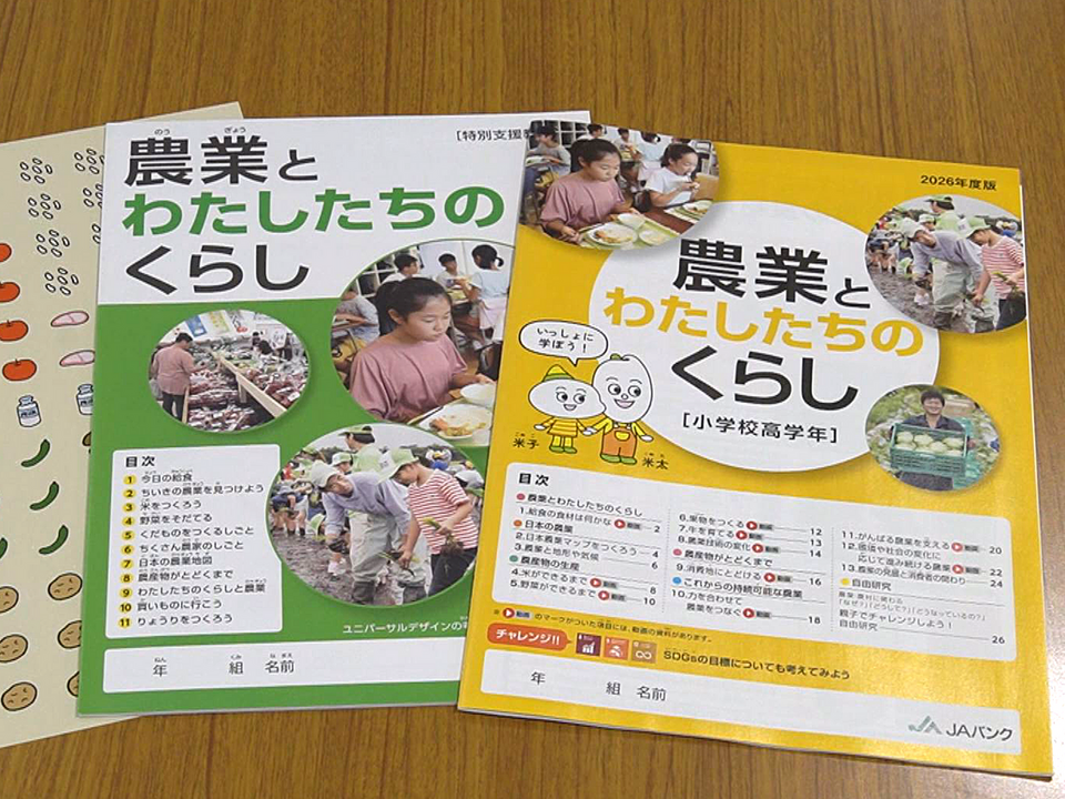 米や野菜、果物などを生産する過程と流通のしくみ、そして周囲の環境が写真付きで分かりやすく説明されていて、県内の全ての小学校と希望する特別支援学校に贈られます。