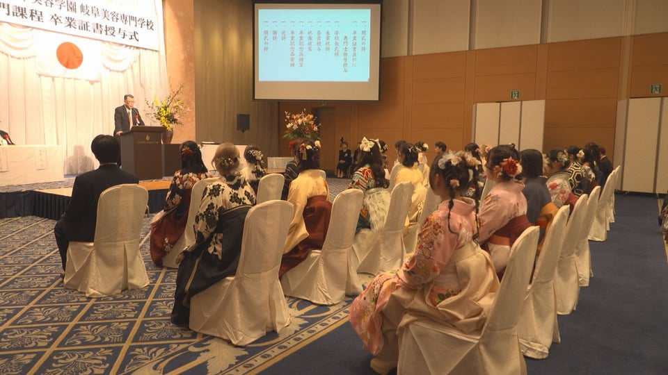 岐阜市の岐阜美容専門学校の卒業式が開かれ、2年間の専門課程を修了した34人が新たな一歩を踏み出しました。