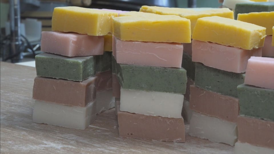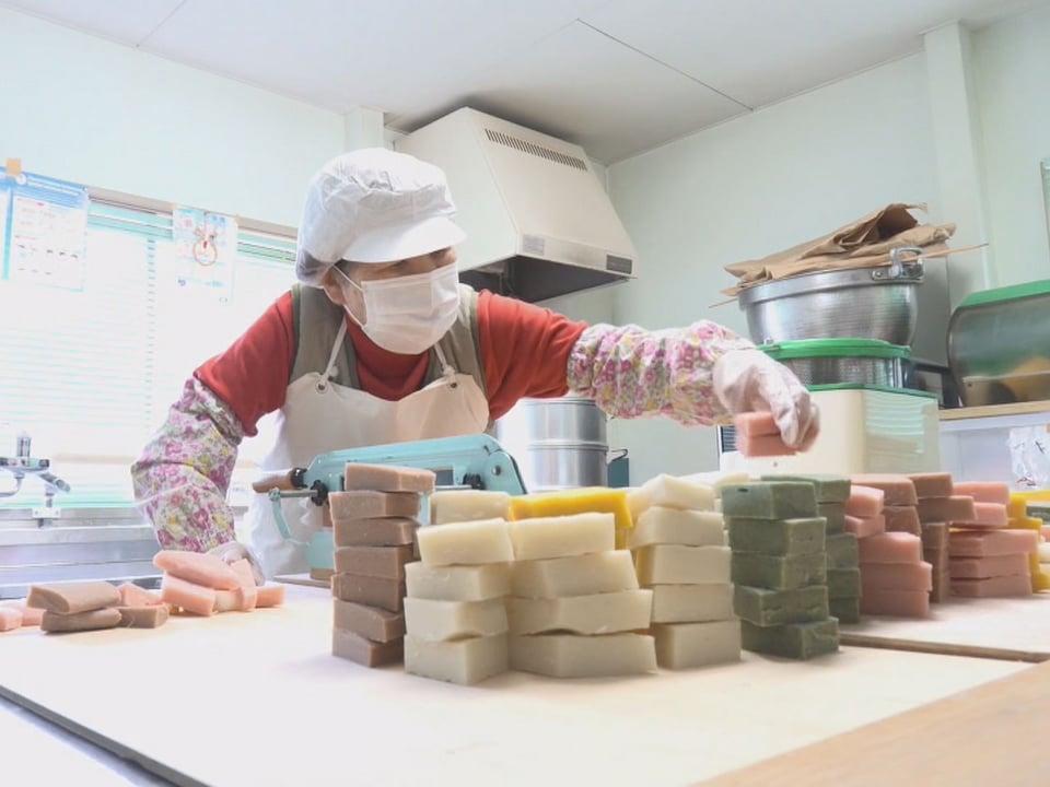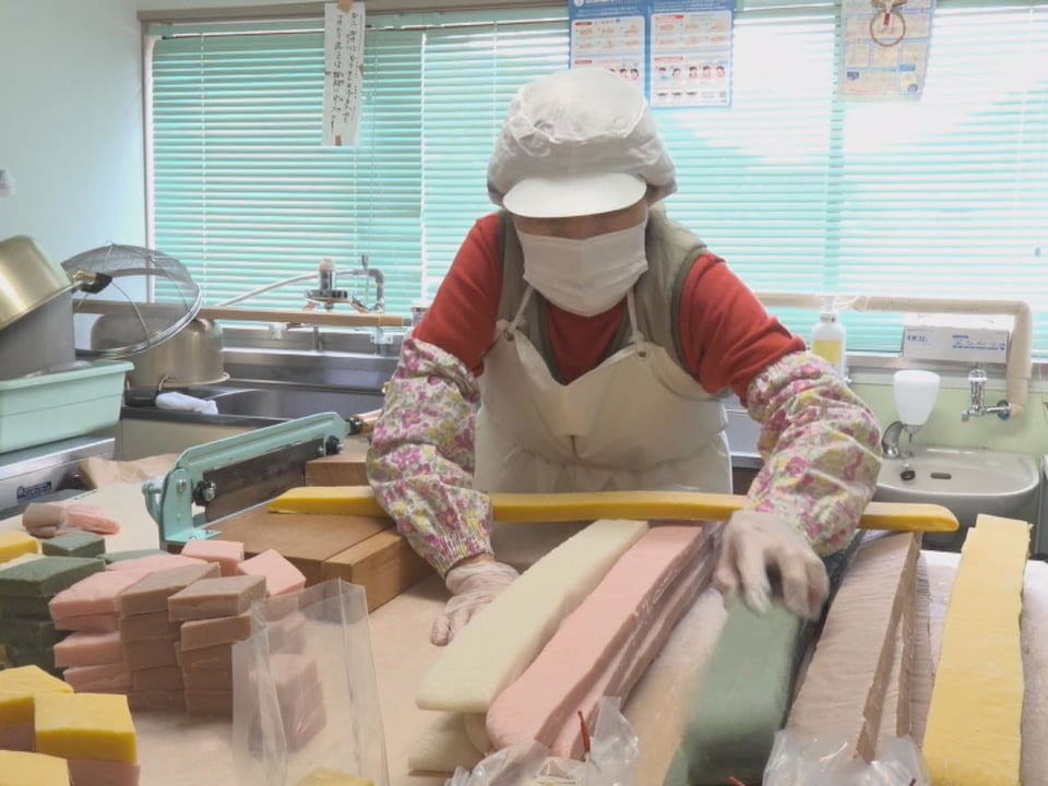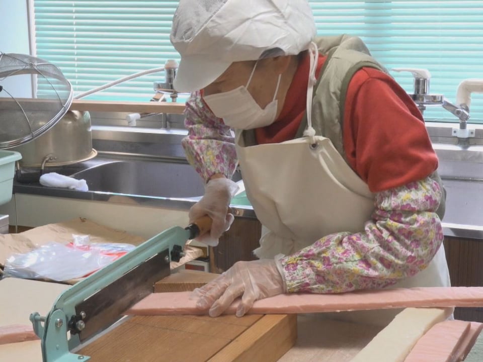 水野さんは、厚さ2センチ、一辺の長さが6センチになるよう、手際よく切り分けていました。