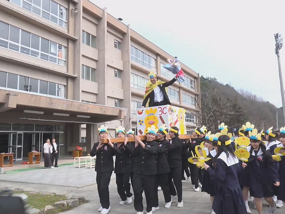 卒業生89人が、先生の顔写真などで飾った3クラス3台の「みこし」に、担任の先生らを乗せて担ぎ上げ、感謝の気持ちを込めて花道を往復しました。