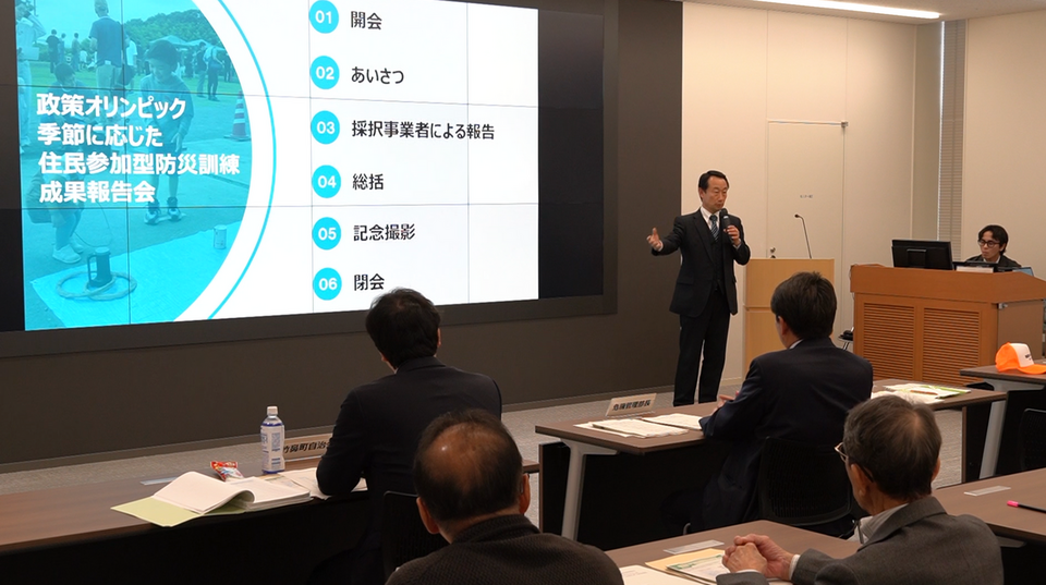 政策オリンピックは、地域の課題解決に主体的に取り組む団体を県が後押しするもので、課題の一つが「季節に応じた住民参加型の防災訓練」です。この日は6つの団体が初年度の活動成果を報告しました。