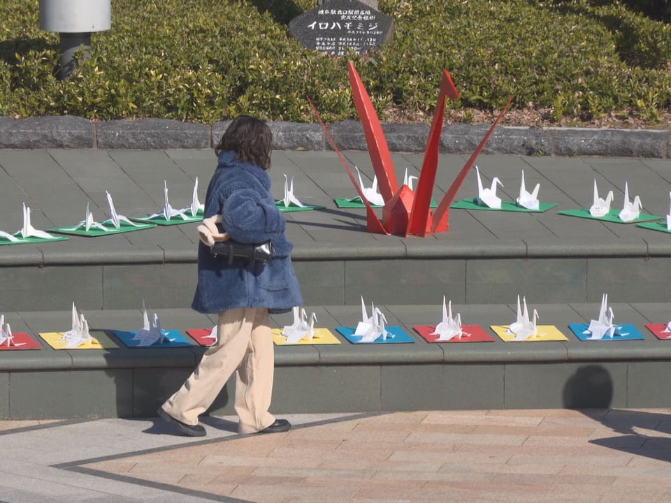 岐阜市のJR岐阜駅北口信長ゆめ広場では、復興支援などに取り組む市民団体「支援グループ岐阜・手と手」が折り鶴を並べて犠牲者を追悼する催しを開いています。