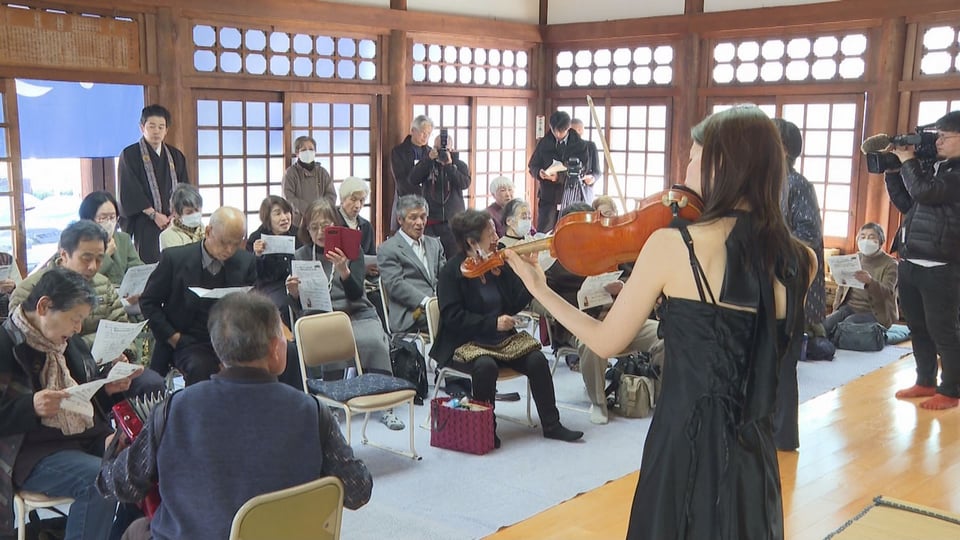 黙とうに先立ち、「ぎふ3・11当事者会」代表の後藤孝二さんが、原発事故を受けて福島から幼い子どもたちを連れて自主避難した体験などを語ったほか、バイオリンの追悼演奏や参加者全員による「花は咲く」などの合唱もありました。