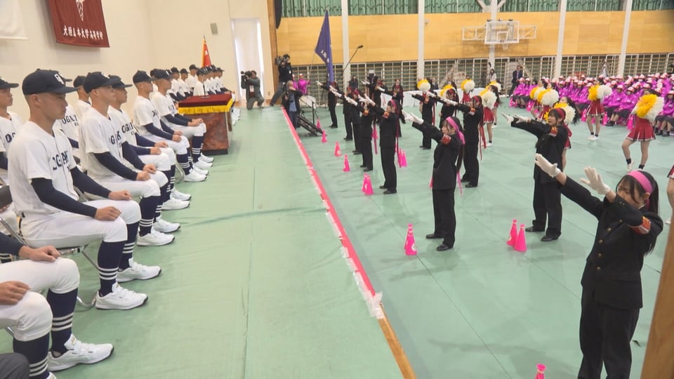 大垣日大の春のセンバツ出場は2年連続7回目。体育館で行われた壮行会では、約700人の生徒の拍手を受けてセンバツ旗を掲げた山﨑智貴主将らユニフォーム姿の選手が入場し、古田健二校長が「甲子園で戦うのは選手だけではない。応援する私たちも一緒に戦いましょう」と呼びかけました。