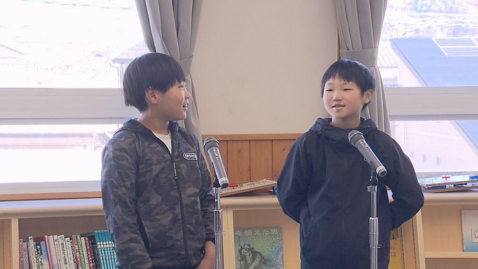 16日の発表会で、児童らは緊張しながらもマイクの前に立って好きなお菓子やゲームをテーマにしたネタを、ボケとツッコミに分かれて披露し、教室は温かい拍手や笑い声に包まれていました。